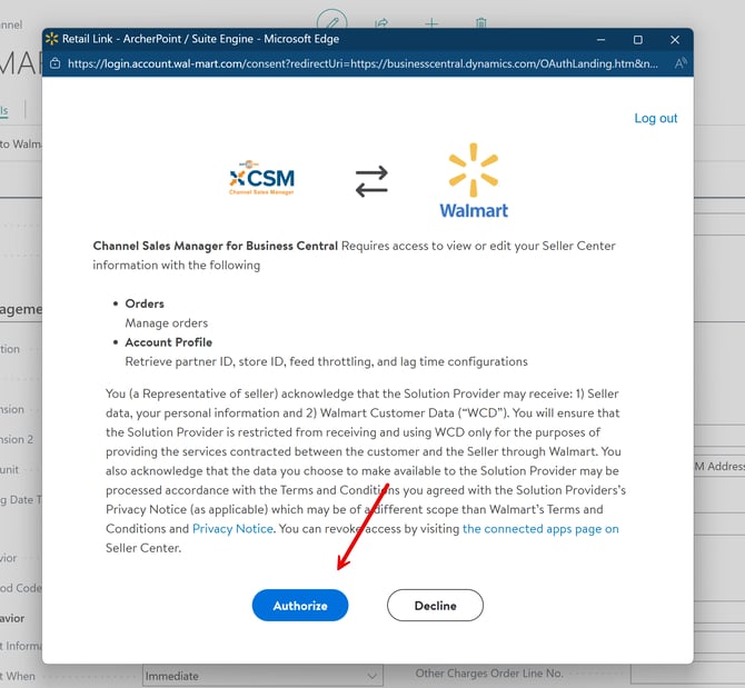 - After logging in, Walmart will ask you to authorize access to CSM; click Authorize